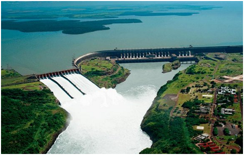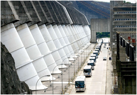 伊泰普水电站,位于巴拉那河流经巴西与巴拉圭两国边境的河段,拦腰截断巴拉那河,该水电站由巴西和巴拉圭两国共同建造。伊泰普(Itaipú)在印地安语中意为“会唱歌的石头”。水电站主坝为混凝土空心重力坝,高196米(海拔225米),长1500米。右侧接弧形混凝土大头坝,长770米。左接溢洪道,溢洪闸长483米,最大泄洪量为62200立方米/秒。坝内蓄满水后,形成了面积达1350平方公里、深度为250米、总蓄水量为290亿立方米的伊泰普人工湖。电站安装了18台发电机组,总装机容量1260万千瓦,年发电量可达750亿度。