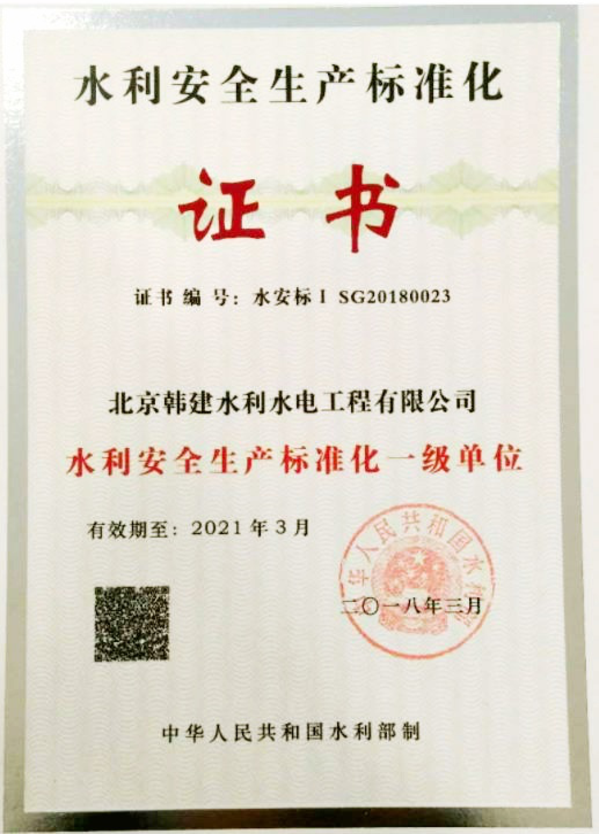 3月12日,水利部办公厅公布了安全生产标准化一级单位名单,北京韩建水利水电工程有限公司名列其中。这标志着我公司安全生产水平跃上了一个新的台阶,为实现企业安全生产工作的规范化、科学化、系统化、法制化,强化风险管理迈出了重要一步。