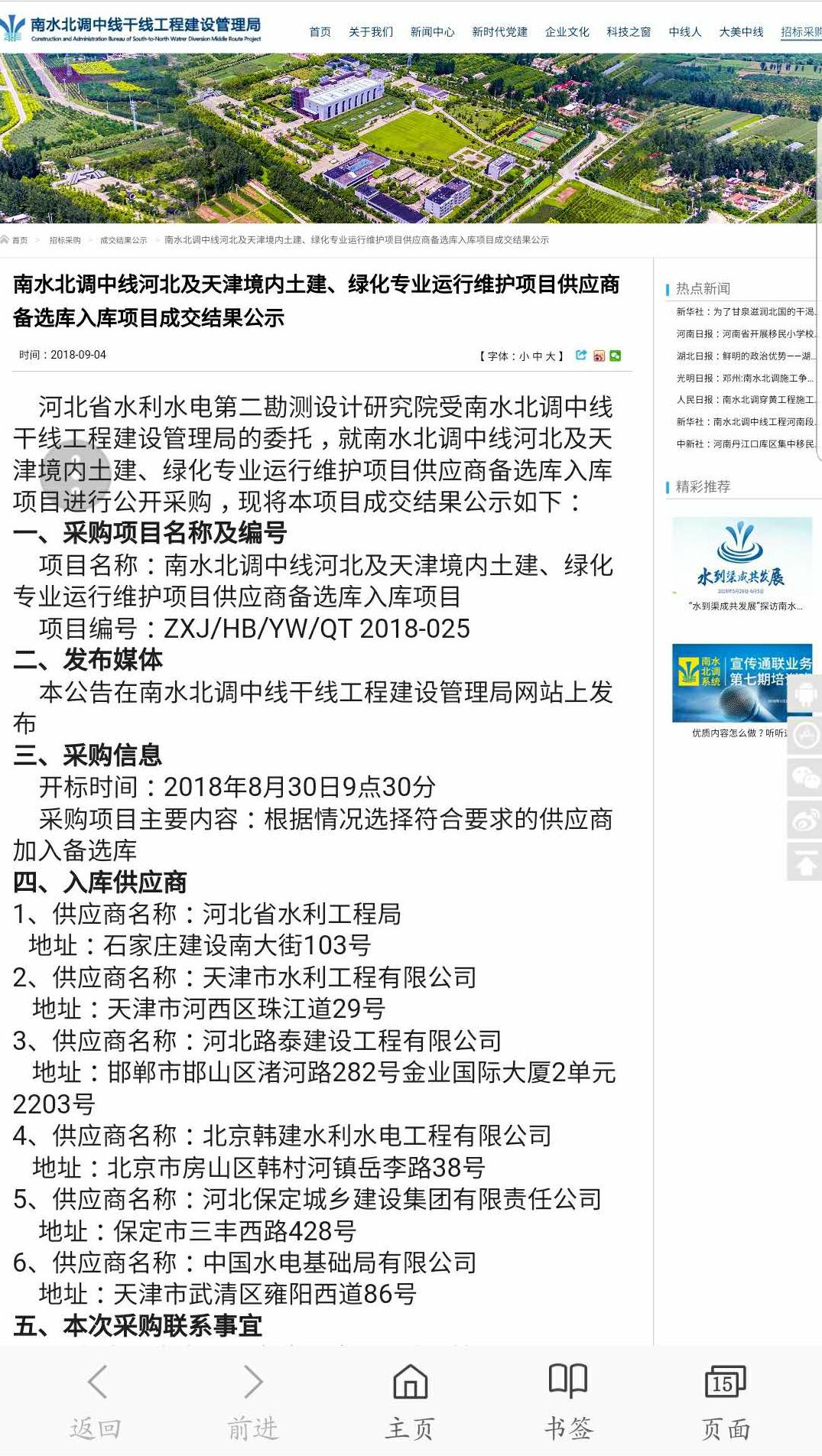 恭贺我公司入围“南水北调中线河北及天津境内土建、绿化专业运行维护项目供应商备选库入库项目”