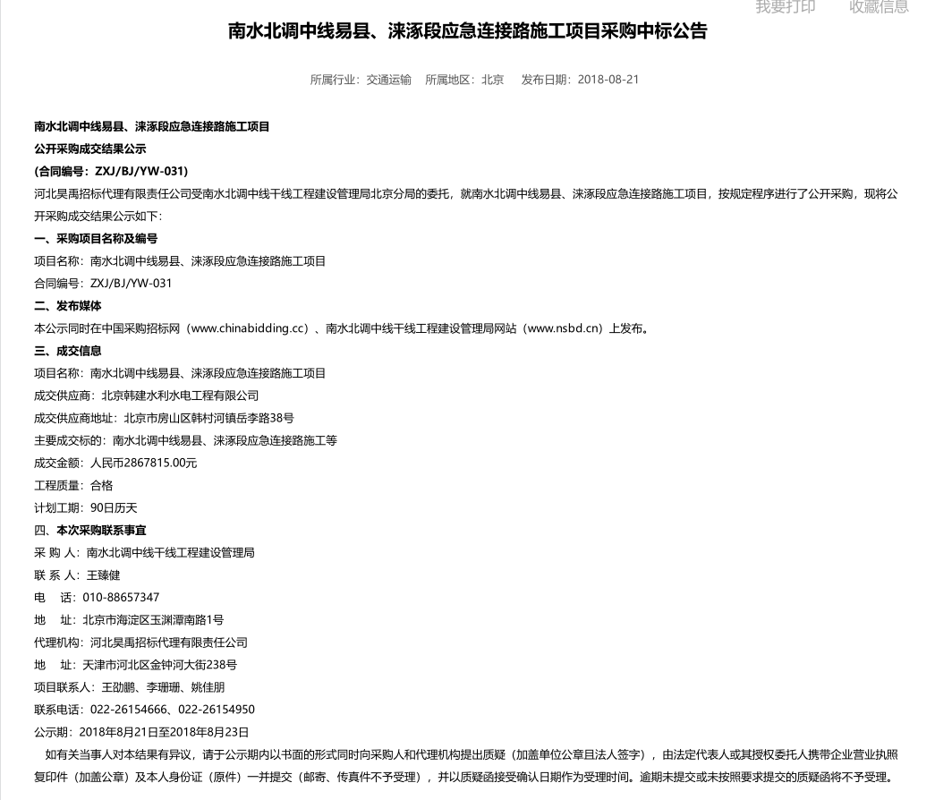 恭贺我公司“南水北调中线易县、涞涿段应急连接路施工项目采购中标公告”