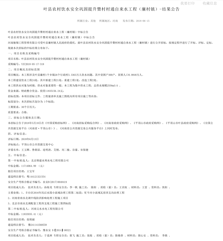 叶县农村饮水安全巩固提升暨村村通自来水工程(廉村镇)