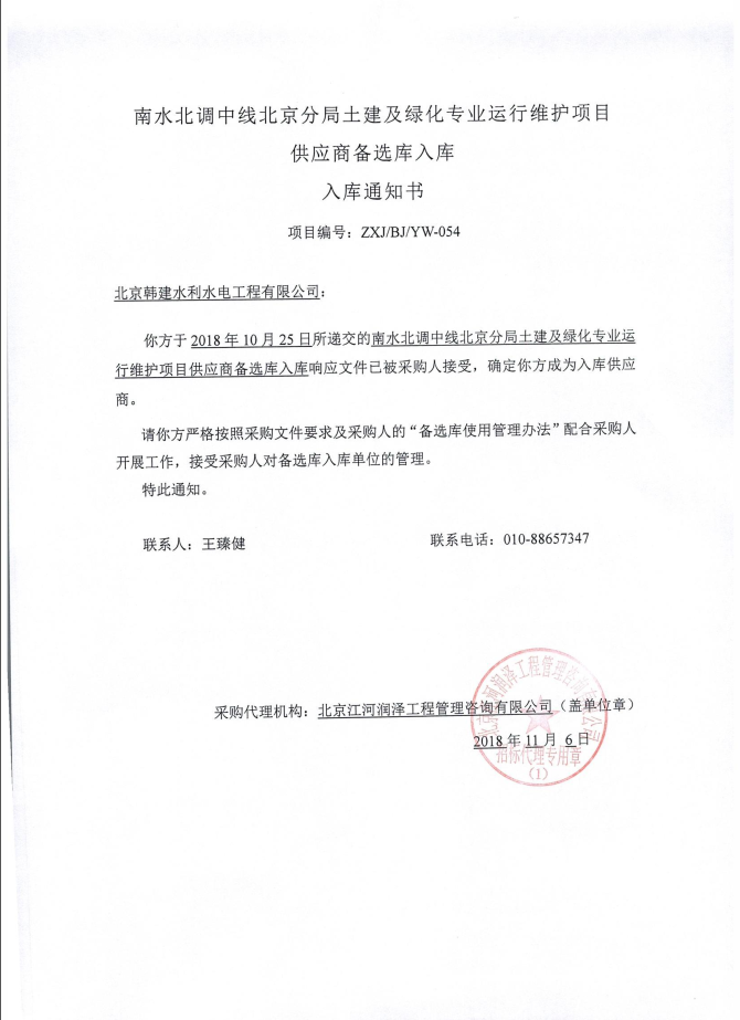 恭贺丨我公司入库“南水北调中线北京分局土建及绿化专业运行维护项目”供应商备选库