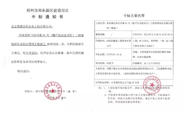恭贺丨我公司中标 “郑东新区白沙刘集01号(棚户区改造项目)三期景观绿化及园区管理网工程施工项目”