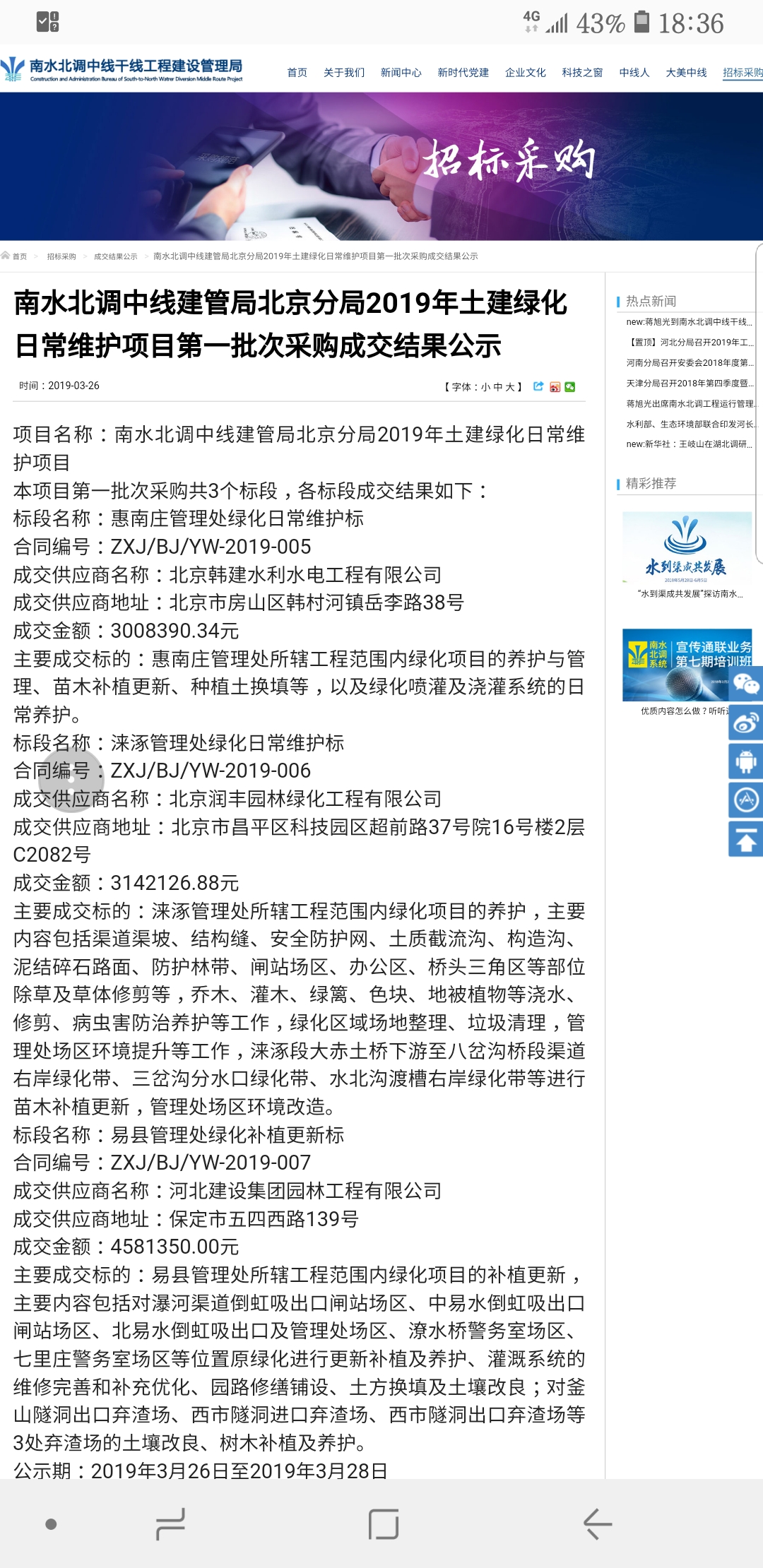 恭贺丨我公司中标 “南水北调中线建管局北京分局2019年土建绿化日常维护项目”