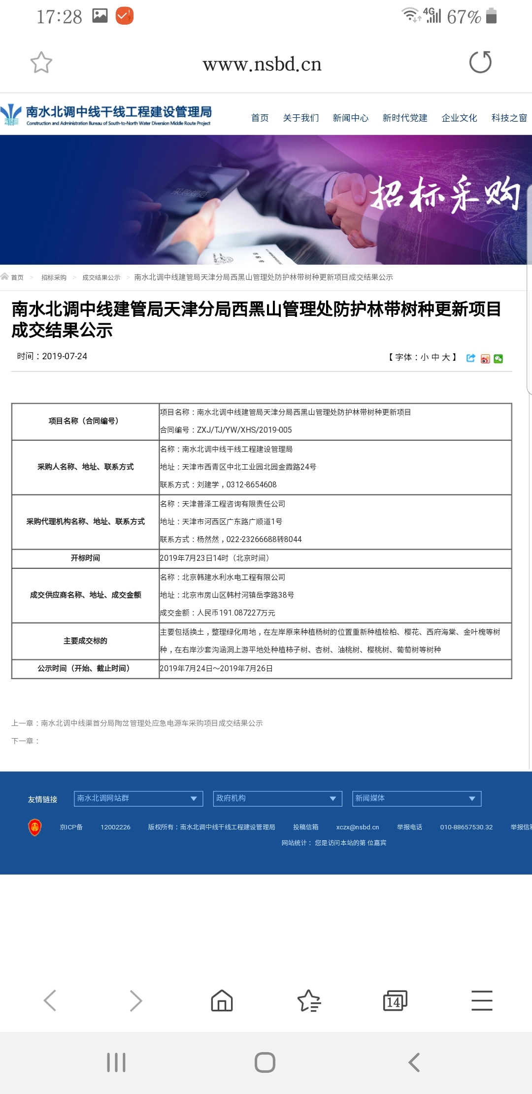 恭贺丨我公司中标 “南水北调中线建管局天津分局西黑山管理处防护林带树种更新项目”