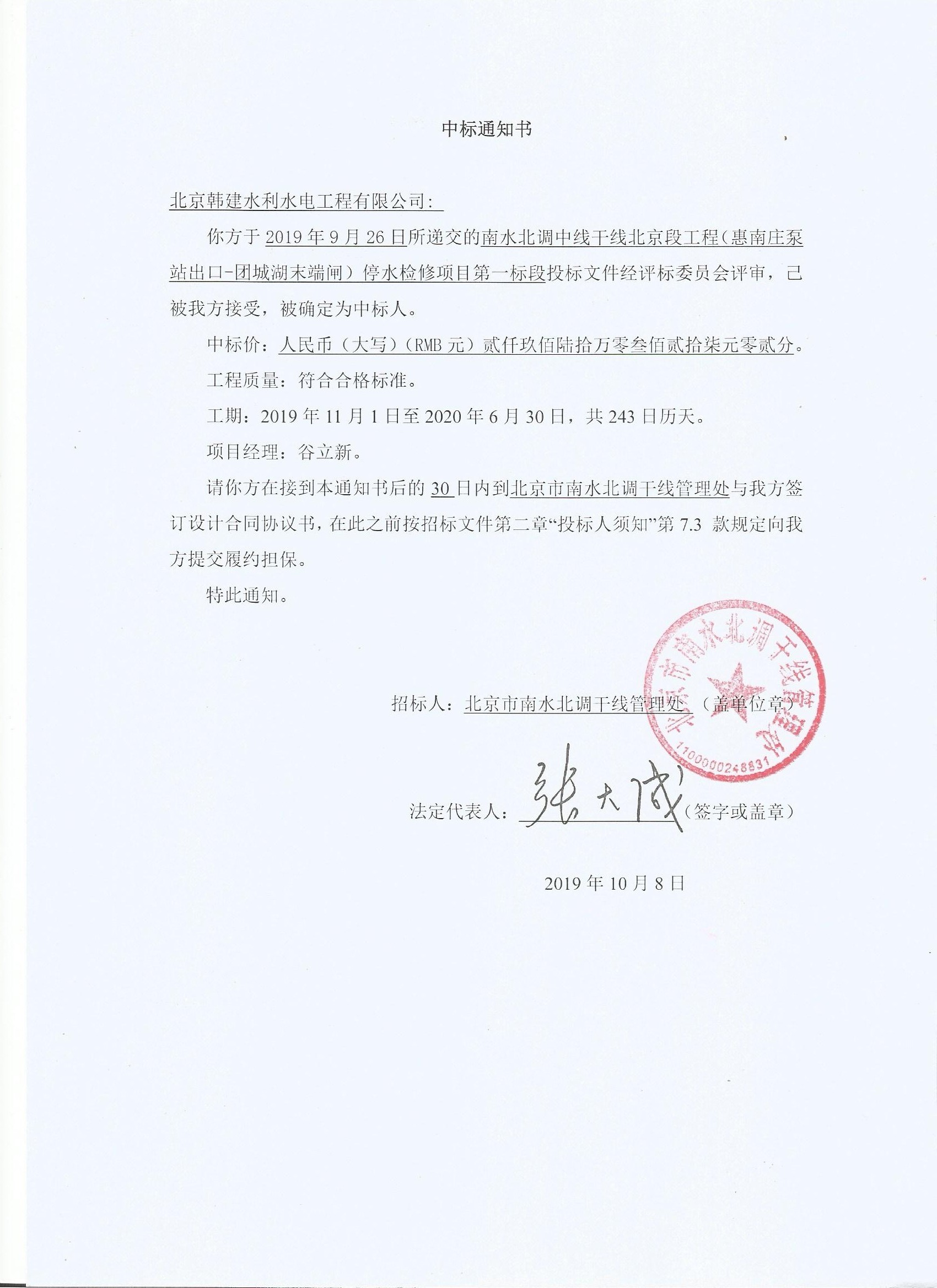 恭贺我公司中标“南水北调中线干线北京段工程(惠南庄泵站出口-团城湖末端闸)停水检修项目第一标段”