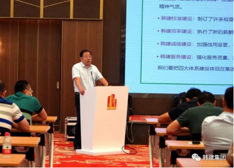 最后,总经理孙海龙对国家政策掌握,加快业务拓展,完善韩建标准、韩建效率、韩建诚信、韩建服务四大体系建设,提升整体水平做工作安排,并对下半年工作提出具体要求:
