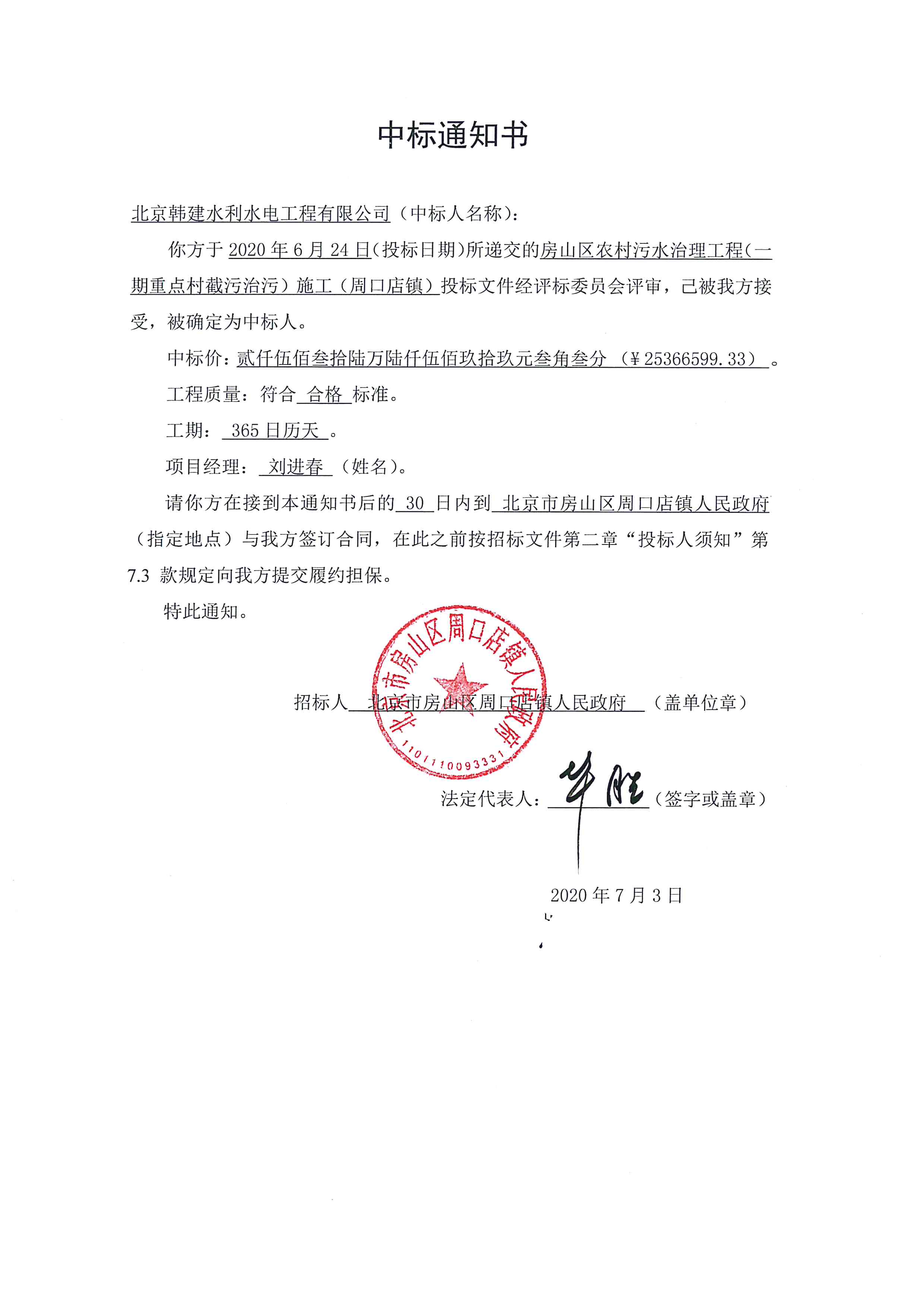 恭贺丨我公司中标 “房山区农村污水治理工程(一期重点村截污治污)施工(周口店镇)”