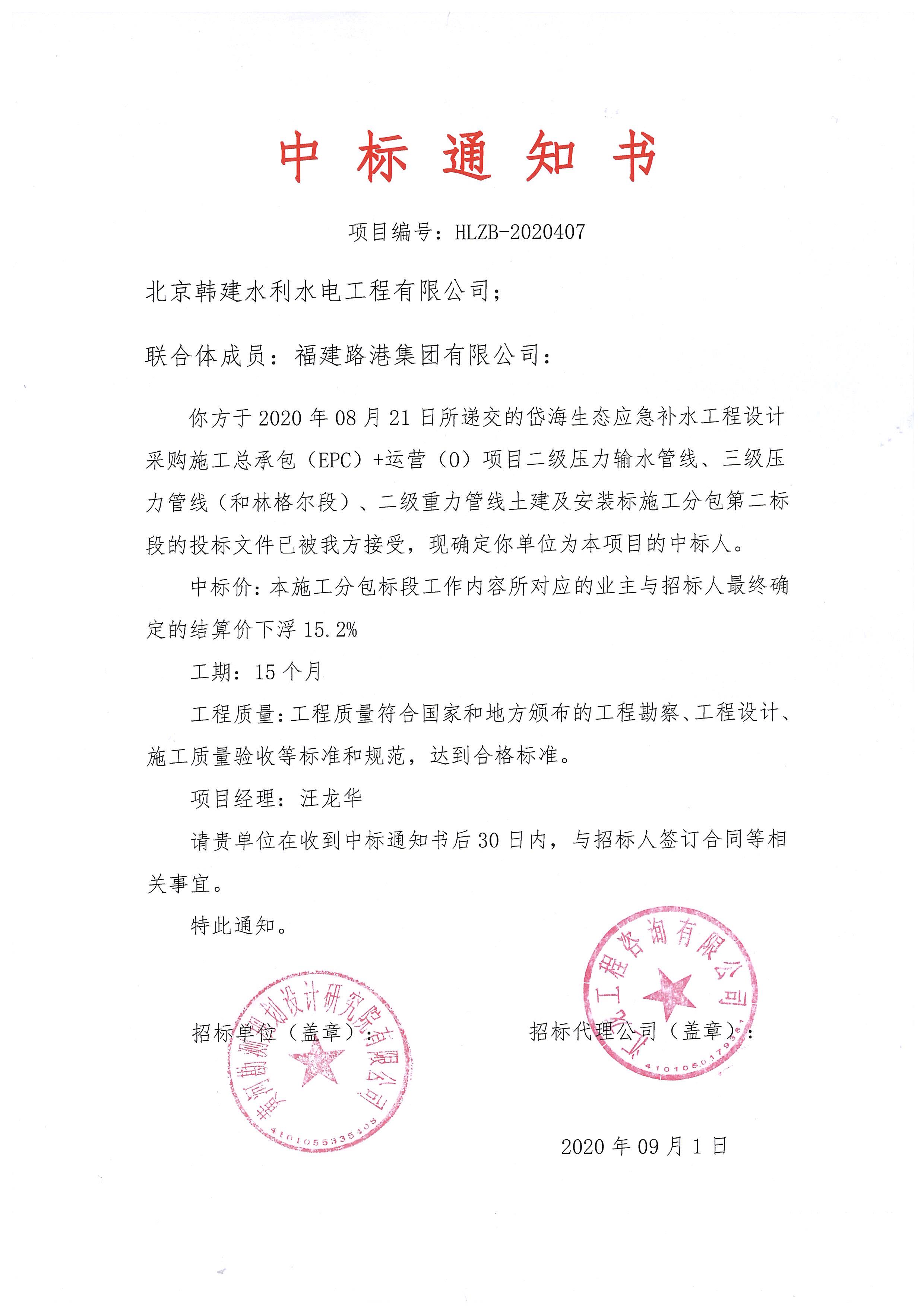 恭贺丨我公司中标 “岱海生态应急补水工程设计采购施工总承包(EPC)+运营(O)项目”