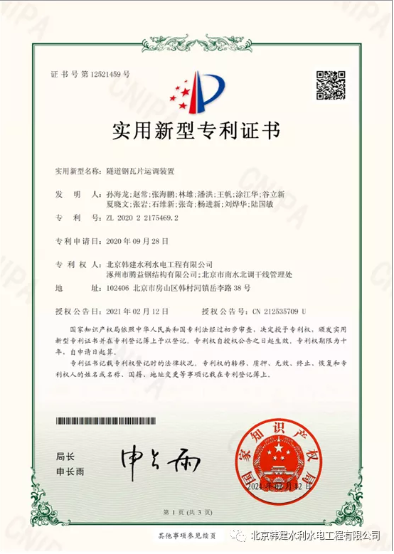 2021年是中国共产党的百年华诞,是“十四五”规划开局之年,更是我司第二个“五年规划”起步之年。在2021年新春伊始,我司迎来了新的好消息:我司主导联名申请的名为“隧道钢瓦片运调装置”实用新型专利,经国家知识产权局审查通过,于2021年2月12日获得该项实用新型专利。