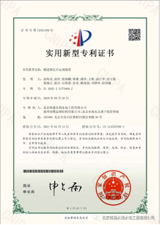 近日,韩建水利水电公司主导联名申请的“隧道钢瓦片运调装置”,荣获国家知识产权局颁发的实用新型专利证书(专利号:ZL 2020 2 2175469.2)。