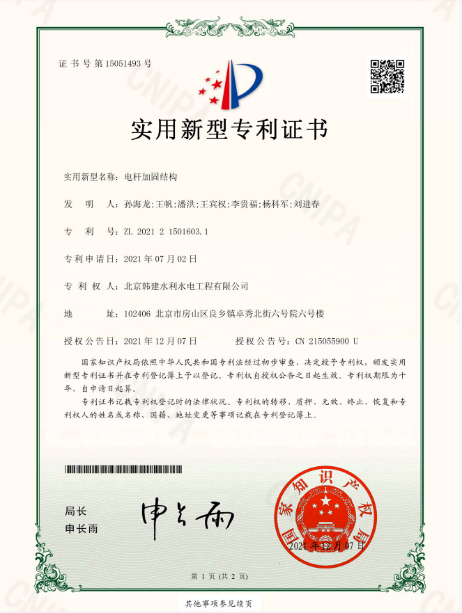 近日,韩建水利水电公司申请的电杆加固结构”,荣获国家知识产权局颁发的实用新型专利证书(专利号:202121501603.1)。