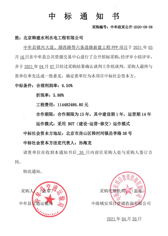 恭贺 I 我公司中标“中牟县镇兴大道、湖西路等六条道路新建工程PPP项目”