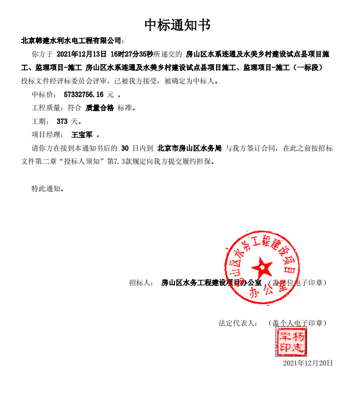 恭贺 I 我公司中标“房山区水系连通及水美乡村建设试点县项目施工”