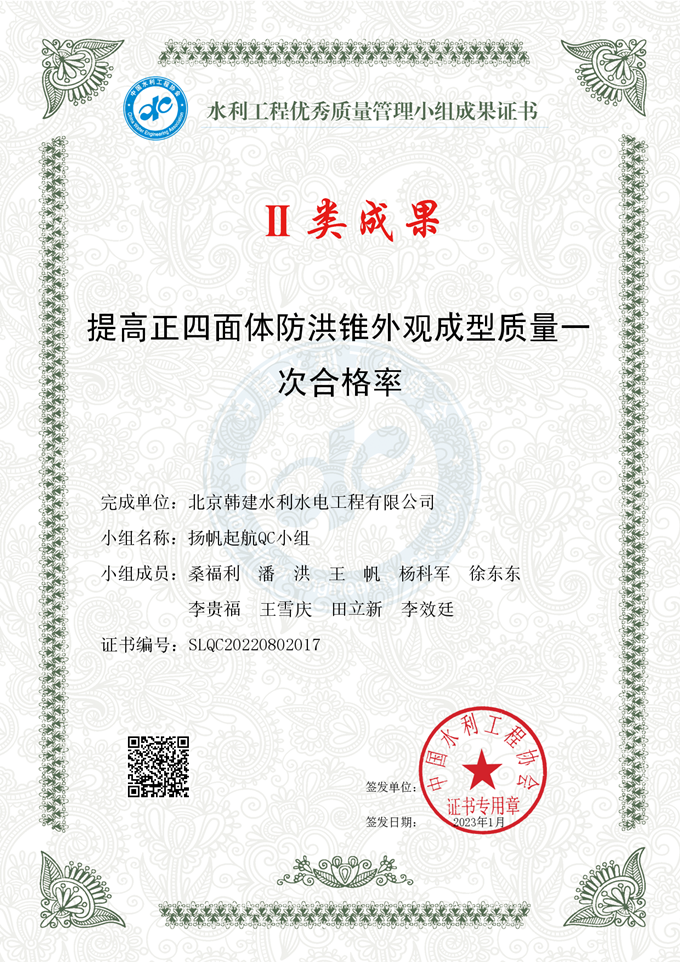 近日,我公司扬帆起航QC小组申报的“提高正四面体防洪锥外观成型质量一次合格率”及“铅丝石笼灌注胶凝材料施工工艺创新”QC成果分别荣获中国水利工程协会水利工程优秀质量管理小组II类成果及III类成果。