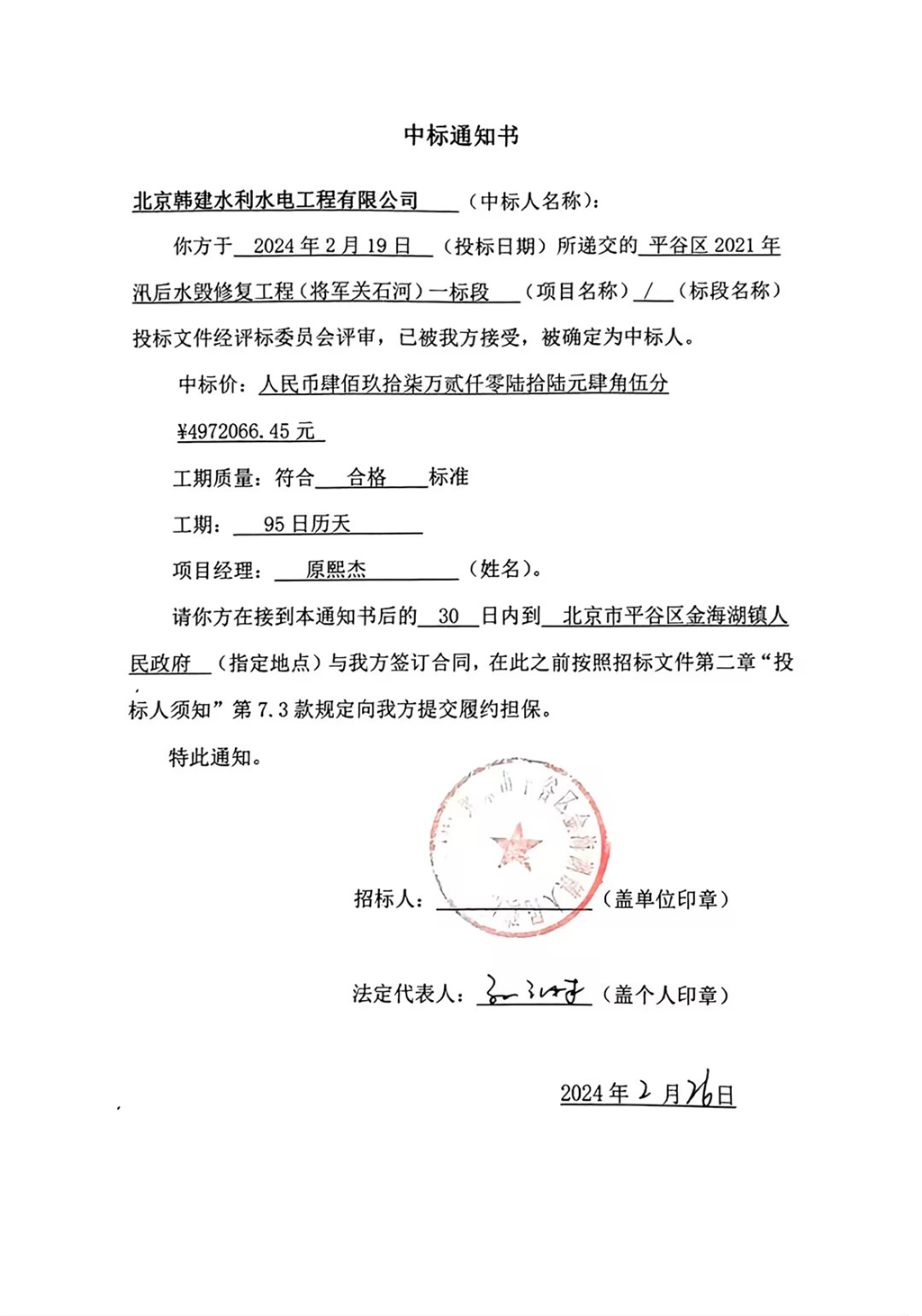 恭贺丨我公司中标 “平谷区2021年汛后水毁修复工程(将军关石河)一标段”工程施工项目